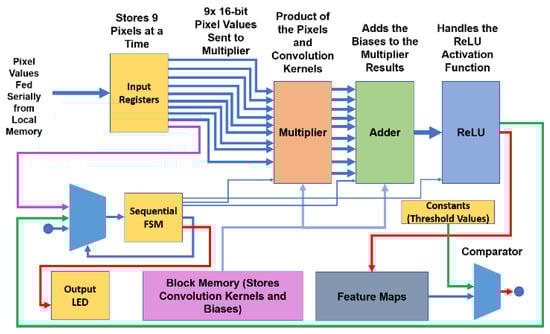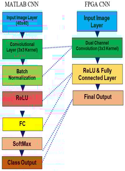 The reduction of layers in the FPGA CNN implementation, as shown in Figure 11, was performed to reduce the circuit logic needed to implement the model. Layers such as batch normalization and the softmax are used primarily for the feed-forward weight adjustment. Hence, the software model needs these layers to generate the hyperparameter values during the training stage. To optimize the classification pipeline for FPGA implementation, the layers were combined retrospectively.
