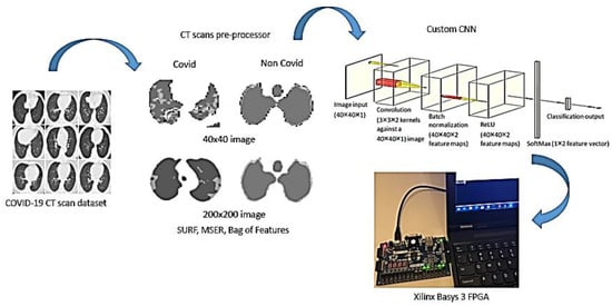 This case study reports the use of hardware accelerators such as FPGAs to accelerate the diagnosis of COVID-19 CT scan images by utilizing a machine learning algorithm. It was demonstrated that an increased rate in detection could lead to performing the necessary measures more promptly than RT-PCR testing. Taking the combined concepts of self-supervised learning [], convolutional image processing techniques, and classification methods [], a solution could be realized to meet the speed and accuracy requirements needed for medical diagnostics based on computer vision. This case study investigated a CNN-based classification method that has been optimized for the classification of COVID-19 CT scans. The authors reviewed and implemented different approaches to develop a machine learning-based method and map it on reconfigurable hardware to improve the overall classification speed. This case study is organized as follows: Section 2 provides data pre-processing methods. Section 3 elaborates on the process behind the design of the proposed CNN and its hardware implementation. Section 4 concludes this case study.