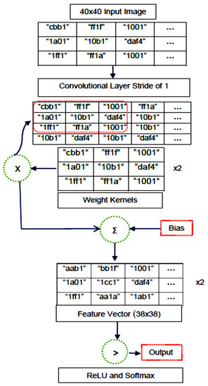 A workflow of the proposed software and hardware implementation of custom-designed CNN is shown in Figure 12, whereas Figure 13 gives an overview of the custom CNN operation. It starts by taking the fixed-point converted image data as a 40 × 40 image. Then two 3 × 3 filters are used as the weighted kernels. These kernels are the same as used in the FPGA implementation. The convolution process involves performing dot-matrix multiplication with both kernels. This creates two channels of feature maps for the cross-entropy classifier to determine the final prediction.