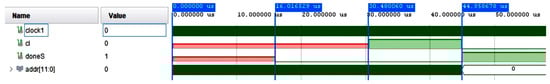 Figure 15 shows the simulated waveforms where the first two blue markers show the time taken to read the positive sample. This shows the desired output of 1 at the ‘cl’ signal, indicating a positive sample is present. The second to the third marker shows the waveform, which is calculating the negative sample, which is read into the classifier. The third to the last blue marker indicates the total time taken for the second sample to be classified. An output of 0 at the ‘cl’ signal indicates a negative sample has been detected. The simulations were performed with a 100 MHz clock frequency. The accuracy of the proposed hardware accelerator investigated in this case study was 95.3% with 0.952 precision, 94.7% sensitivity, 0.95 specificity, and 0.949 F1 score.