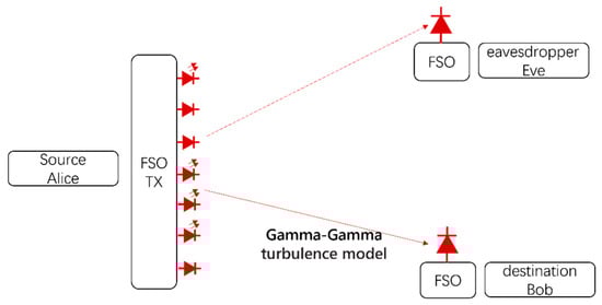 However, the above papers have not fully considered the PLS of VLC based on the space shift keying (SSK) system. SSK modulation is a special mode of SM. Since it does not use the traditional digital baseband modulation technology, it has the advantages of low hardware cost and low detection complexity while ensuring system reliability. As in RF communication, the concept of SSK can also be applied in the VLC area by using the appropriate channel model and transmitter, such as LED. Applying SSK modulation technology to the VLC system has become an effective way to improve the system’s ability to transmit data. In order to further reduce the complexity of the modulation and demodulation process, Jeganathan et al. proposed a simplified version of SM called SSK in [15], which only uses the spatial dimension to transmit information. This modulation scheme activates only one transmitting antenna to represent information at each transmission time, and other transmitting antennas do not work. In [16], to improve the data transmission rate, Bao et al. proposed a new generalized SM scheme based on the indoor VLC system. In [17], Wang et al. used the minimax criterion to select LEDs of GSSK-VLC systems for optical communication. Experiments showed that the average mutual information (AMI) between Bob and Eve can be further improved. Thus, the PLS security of SSK-VLC systems should be considered. In [5], two techniques were introduced to improve the PLS of VLC systems which use GSSK modulation. In the first technique, the authors applied the spatial constellation design (SCD) to boost the BER performance of Bob and reduce the BER performance of Eve. For the second technique, the authors combined the appropriate beamforming vectors at the relay with NOMA to enhance the PLS of the VLC system. In [18], Ben et al. considered the AN to enhance the PLS performance of the indoor MISO VLC system and derived the upper bound and the lower bound of SR. In the system, the minimum mean squared error (MMSE) equalizer is adapted to detect the receiving signals from the multi-user. Compared with the systems without AN, the SR performance can be improved with the help of the AN. Then, the SR performance is further improved by setting the appropriate power of AN. In [19], an optical jamming strategy was proposed to enhance the PLS for GSSK-VLC systems. In the system, the sender is designed to transmit the effective signal alone with the optical jamming which obeys the appropriate power constraint. Results showed that the PLS of the system can be enhanced in terms of achievable SR. However, the impact of atmospheric turbulence on VLC is not considered.