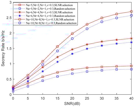 where is an ordered permutation set of . Therefore, the best condition is to select the first SLNR values from Equation (21). Based on the selected SLNR, the corresponding antenna can be obtained. The larger the SLNR value, the more significant the difference between the eavesdropping channel and the legitimate channel. Compared with the non-antenna selection scheme, the system performance is improved. The complexity of the method based on SLNR is divided into two parts. The first part of the operation is to calculate the SLNR values, and the second part is the sorting operation [31]. Therefore, the complexity of the AS method based on SLNR can be expressed as + .