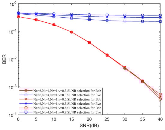 Figure 2 shows the relation between the SR value and the SNR value for different schemes under values ( = 0.1, 0.3, and 0.5). In the simulation, at the receiver, , and at transmitter are assumed. The SR values of all the schemes increase as the SNR values increase. In addition, as the value increases, the SR values of all the schemes increase because as the value increases, the interference of AN on the eavesdropper also increases, which leads to higher SR. Furthermore, the SR values of SLNR schemes outperform the SR values of random selection schemes. Figure 3 shows the relation between the SR value and the SNR value for different schemes under different (, ) situations. Specifically, (5, 2), (6, 4), and (10, 8) pairs are considered. In Figure 3, SR values of all schemes increase with the increase of SNR value and tend toward the saturation point. Among all the different (, ) situations, the schemes with the (10, 8) pair achieve the best SR performance. Figure 4 shows the relation between the BER values and the SNR values of Bob and Eve for different schemes under the (6, 4) pair situation. As shown in the figure, the BER values of all the schemes decrease as the SNR values increase and the BER values of Bob are lower than the BER values of Eve in all the schemes. In addition, the BER value of Bob in the SLNR scheme is lower than the BER value of Bob in the random selection scheme while the BER values of Eve in all the SLNR and random selection schemes are similar. Therefore, it can be concluded that the BER performance of the SLNR scheme is better than the one of the random selection scheme. Figure 5 shows the relation between the BER values and the SNR values of Bob and Eve for the SLNR scheme under the (6, 4) pair situation and different values ( = 0.3, 0.5, and 0.8). As shown in the figure, the BER values of all situations decrease as the SNR values increase and the BER values of Bob are lower than the BER values of Eve in all situations. In addition, as the value increases, the BER value of Bob decreases and the BER value of Eve increases. Therefore, we can conclude that the bigger value can bring the better performance for the proposed scheme. Therefore, a higher value can be set to decrease the BER of Bob and increase the BER of Eve to improve the security performance of the system. Figure 6 shows the relation between the BER values and SNR values of Bob and Eve for different schemes under different (, ) situations. As shown in the figure, the BER values of all schemes in all situations decrease as the SNR values increase and the BER values of Bob are lower than the BER values of Eve in all schemes in all situations. In addition, among all the different (, ) situations, the schemes with the (5, 2) pair achieve the lowest values of BER for Bob and Eve.