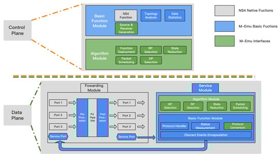 The Service-Forwarding Architecture contains a control plane and a data plane. As for the control plane, M-Emu adds basic function module and algorithm module on the basis of the existing functions of NS4’s control plane. The data plane of M-Emu is divided into a forwarding module and service module. The forwarding module contains all the functions of the NS4’s data plane and adds the function of interacting with the service module. The service module is the core of M-Emu’s Service-Forwarding Architecture, which enables the data plane of M-Emu to deal with complex multicast protocols and algorithms. The architecture diagram is shown in Figure 1.