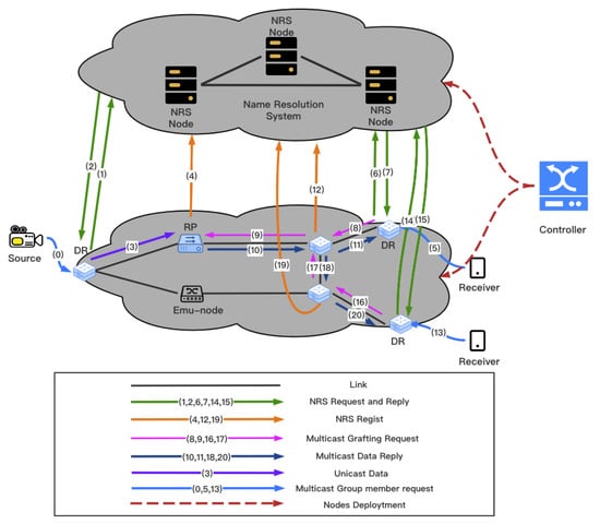 As shown in Figure 2, the controller can deploy RP, DR, NRS and Emu-nodes in the network according to the logic of its function deployment module. All RPs register their NAs on NRS with the same specific identity. The data source generates the data and the multicast service ID and sends it to DR (arrow 0). After receiving the data from the source, DR sends the RP request (arrow 1) to NRS, and NRS replies with the RP NAs list (arrow 2). DR selects an RP as the root of the multicast distribution tree according to the RP-selection method and sends data to the selected RP (arrow 3). Our Multicast-Emulation Framework considers that no multicast transmission path is constructed between the source-side DR and RP, and thus the data is transmitted through unicast in this stage.