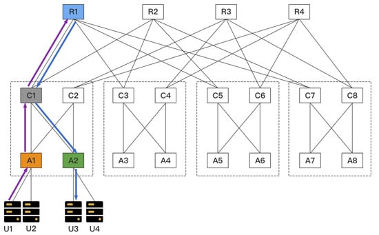 We take the emulation of PIM-SM as an example to explain in detail how the various parts of M-Emu cooperate to complete the multicast emulation. We emulate PIM-SM in a fat tree topology, which is shown in Figure 4.