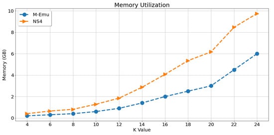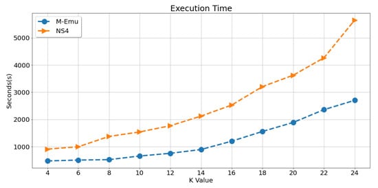 In this part, we compare the execution time required by each architecture when processing the same number of multicast flows (1000 multicast flows). The execution time is related to many factors, such as the memory consumption, CPU utilization and so on; thus, it is a comprehensive factor to measure each architecture’s performance. The results are shown in Figure 13. It can be seen that, with the increase of K, the execution time of these architectures increases gradually. The execution time of M-Emu is about 1/2 of that of NS4.