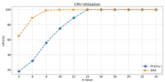 In this part, we compare the CPU consumption of each architecture in fat tree topologies when processing 1000 multicast flows. The results are shown in Figure 10. It can be seen that, with the increase of K, the CPU utilization of M-Emu rises slower than that of NS4. When K = 4, the CPU utilization of M-Emu was about 30% of that of NS4. This is because NS4 needs to forward packets from switches to service nodes, and it also needs to parse or encapsulate packets from the link layer to the application layer on the service nodes.
