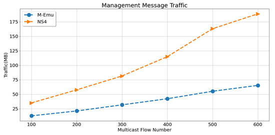 In a fat tree topology with K = 6, we compare the management traffic required by each architecture when processing the same number of multicast flows. The management traffic refers to the traffic of multicast tree establishment and maintenance message. As can be seen from Figure 11, as the number of multicast flows increases, the management traffic of each architecture increases. The traffic of management messages of M-Emu is about 1/3 of that of NS4. This is because, for NS4, the traffic between service nodes and switch nodes accounts for about 2/3 of the total control management traffic, and this part of the traffic can be omitted in M-Emu.