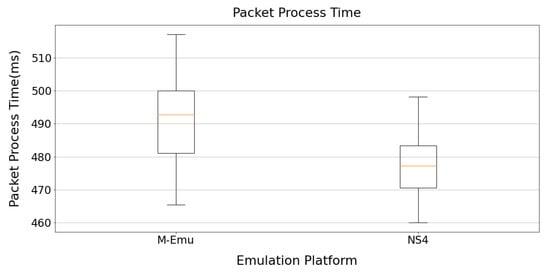 Since the protocol conversion module of M-Emu needs to modify the header of each packet, the packet processing delay will increase slightly on Emu-node compared with NS4. We ran 1000 packet interactions with the real environment and compared the packet processing time of M-Emu with that of NS4. The results are shown in Figure 12. It can be seen that the modification of the packet header does increase the packet processing time slightly, by about 3% compared with NS4.