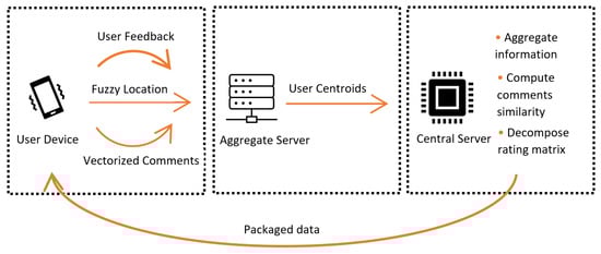 As Figure 2 shows, physically, there are three significant components in this model. The first part is the users’ mobile devices where raw data are preprocessed and final recommendations are generated. In each user’s POI recommendation application, the device keeps records of their private information, such as the locations they visited and the comments they left. Specifically, each device needs to carry out three data processing tasks corresponding to each type of private data. (1) Each user’s comments are vectorized using the embedding tool “Doc2Vec”. (2) The mobile device uploads user feedback through secure ad hoc P2P Wi-Fi Direct to the nearby aggregator server. (3) The user’s device uploads a package containing recent anonymized ratings and matching vectorized comments. In the first component, the environment is comparatively secure and the data process level is low, meaning that it is closer to raw private user data.