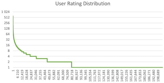 The user rating distribution (Phoenix). The X axis represents the numerical user IDs starting from 1. For example, if we have 10 users, they will be numbered from 1 to 10. The Y axis is the number of ratings they have left and it is on log scale to show a clearer distribution.