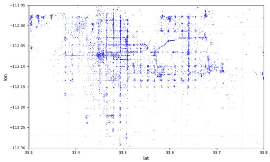The user visiting locations (Phoenix). Each point represents a user visiting a real-world geographical location. (Abscissa: the latitude; Ordinate: the longitude).