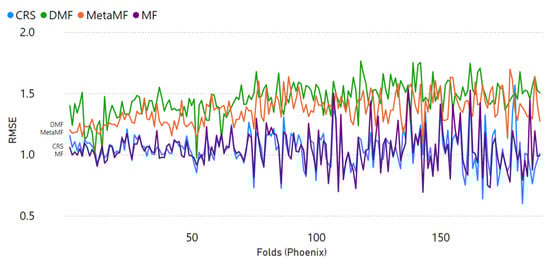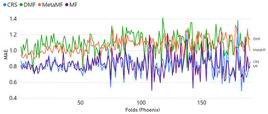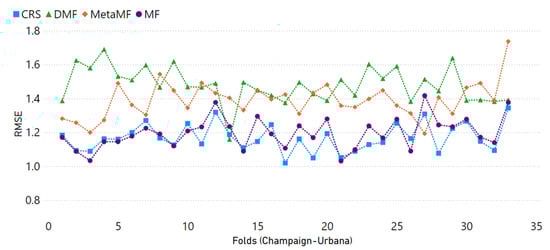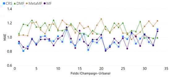 We compare our CRS with the three aforementioned models with the classic biased MF as the baseline. For fairness, the data filtering methods and preprocessing are the same for all models involved. The overall results are presented in Table 3. It is worth noting that even though the scales of the two areas are different, we strive to show the same detail in our results presenting the results from each training–test pair. The fold size is 1000 ratings for the dataset of Champaign-Urbana and 3000 ratings for the city of Phoenix. The RMSE and MAE of each fold are shown in Figure 5, Figure 6, Figure 7 and Figure 8.