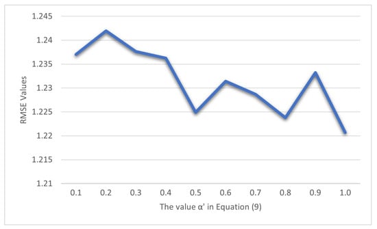 In CRS, we set to 0 to maximize the effect of user location. However, this does not mean it is always a better choice to exclude all contributions from the similarities based on user feedback. For example, Figure 9 shows the comparison of the final RMSE by selecting different in 1.0, 0.9, 0.8 …0.0. is set to 6. It is worth noting that the best result was achieved when k is 1. This may be caused by the sparsity of the dataset and that the data are clustered. For the coefficients of the loss function, , and are set to , and , respectively. For each round of training, is as small as 20 to achieve convergence. Finally, is set to 9.