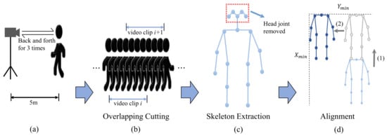 The overall process of data collection and preprocessing. All the videos captured in process (a) are then cut into the same length in (b). In process of (c), HRNet was used to extract human skeletons. (d) shows the process of skeleton alignment.