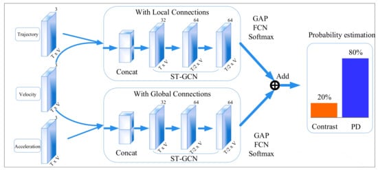 As mentioned in Section 1, the motor abnormalities of some PD patients are not obvious or even subtle, thus making it difficult for common neural networks to detect. To solve this problem, we present an asymmetric dual-branch network to extract local features and global features separately. In addition, the velocity and acceleration information, which are very important for PD detection, are also input into two branches, respectively, to detect detailed motion features. The structure of our network is shown in Figure 3.