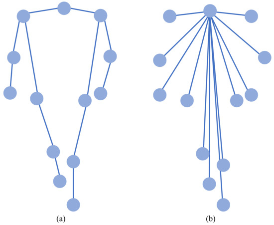 In the first branch, natural connections of body skeletons are used to construct the spatial graph. This branch is designed to extract local features, while in the second branch, the neck joint is selected as the center joint, and all the other joints are connected to it. Compared with natural connection, this connection allows the network to pay more attention to the key areas with high incidences of abnormal Parkinson’s disease actions, and at the same time, it is more convenient to perceive global information because the information between key areas is not restricted by natural connections.
