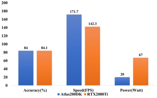 First of all, we use the complete test dataset to test on edge devices and record the accuracy and inference speed. As shown in Figure 6, the model suffers a slight decrease in accuracy while the inference speed is way faster than that of the RTX2080Ti. Moreover, Atlas200DK’s power consumption is significantly lower than RTX2080Ti. After we use FP16 for model training, the accuracy drop of model deployment is almost negligible (0.1%).