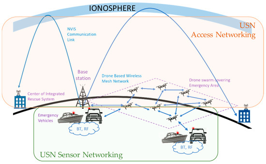This architecture instantiation would also meet the requirements defined in the ITU T Y.1271 recommendation [9], especially those regarding pre-emption of non-emergency traffic to free bandwidth, restorability, mobility, and interoperability. Note that this proposal offers some interesting trade-offs. On the one hand, the NVIS technology enables HF communications (in the range between 3 MHz and 10 MHz, according to the status of the ionosphere [61]) with low bit-rates (up to 60 kbps) without the need for line-of-sight (i.e., electromagnetic waves are directed toward the ionosphere) in a surface with a radius up to 250 km [61] using a single-hop communication [62]. Although the bitrate might be too low for certain applications (e.g., real-time video), this inexpensive (compared to satellites) technology can operate in electromagnetically challenging scenarios such as wells, gorges, or canyons. On the other hand, as already seen in the systematic literature review, the UAV network greatly extends the range of the Access Networking layer, but it also may add a considerable delay onto the communications. Therefore, Delay Tolerant Network (DTN) protocols [63] shall be required to make these communications reliable and robust.