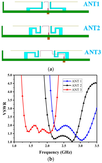 (a) The structure of ANT 1, ANT 2, and ANT3; (b) VSWR of ANT 1, ANT 2, and ANT3; (c) impedance of ANT 1, ANT 2, and ANT 3.