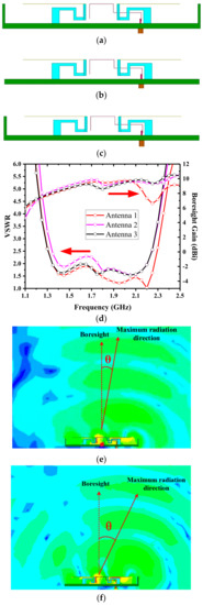The antennas with three types of ground are discussed in this section. The first type is the one with two symmetric vertical walls, as shown in Figure 6a. The second type is shown in Figure 6b. This antenna has a flat ground. The third one is our proposed antenna, which has only one vertical wall on the left side of the flat ground, as shown in Figure 6c. The above three types of antennas are named antenna 1, antenna 2, and antenna 3, respectively. The simulated VSWR and boresight gain of them are depicted in Figure 6d for comparison, simultaneously. Obviously, the impedance bandwidth (VSWR < 2) of antenna 1 and antenna 2 ranges from 1.35 to 2.25 GHz (50%) and from 1.75 to 2.2 GHz (22%), respectively. The boresight gain ranges from 6.6 to 9.7 dBi and from 9.04 to 9.6 dBi, respectively. From the red curve in Figure 6d, it is seen that a significant drop on boresight gain happens at 2.2 GHz for antenna 1. The frequency is at the upper side of the operating band. Here, we point out that this drop at 2.2 GHz for antenna 1 is due to the maximum radiation direction in E plane deviating from the boresight, as depicted in Figure 6e. The angle of deviation is θ = 10°. However, from the purple curve in Figure 6d, antenna 2 has a good boresight gain without drop but a bad VSWR at the lower band. To maintain the advantages of the impedance bandwidth of antenna 1 and the boresight gain of antenna 2 simultaneously, a method to erect only one vertical wall on the side of the ground is taken. Firstly, a single vertical wall is erected on the right side of the ground. However, the radiation field deviates from the boresight to the right side more seriously, as shown in Figure 6f. At this step, the angle of deviation is up to θ = 21°. Therefore, an idea of only erecting a single vertical wall on the left side of the ground is adopted. As the radiation field shows in Figure 6g, the maximum radiating direction is close to the boresight when the single vertical wall was erected on the left side. The angle of deviation is θ = 4° at this time. From the black curves in Figure 6d, the impedance bandwidth (VSWR < 2) of antenna 3 ranges from 1.35 to 2.2 GHz (47.9%) and the boresight gain ranges from 8.1 to 9.6 dBi. As mentioned above, antenna 3 indeed keeps the bandwidth and avoids the gain drop of antenna 1.