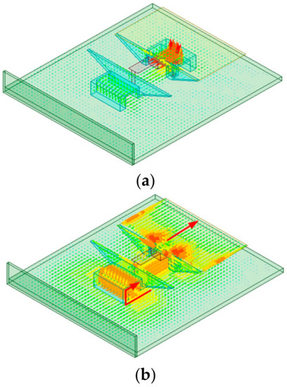 The working mechanism of the proposed antenna is analyzed by plotting the distribution of surface current. Here, it is pointed out that the proposed ME dipole antenna has its ME mode at 1.4 GHz. Therefore, the surface current in one period (1T) is given at 1.4 GHz and is shown in Figure 7. For simplicity, let t = 0 when the antenna is initially excited. As shown in Figure 7a, the surface current on the whole antenna is very weak at t = 0 and large current is just going through the feeding port to the antenna. However, the current on the top sheet, the bended surface, and the ground between these bended surfaces are strong at t = T/4, as shown in Figure 7b. The current flow is marked by a red arrow. At t = T/2, the surface current is similar to the case at t = 0 except for a reverse current flow, as shown in Figure 7c. At t = 3T/4, the current on the top sheet, the bended surface, and the ground between these bended surfaces become strong again, as shown in Figure 7d. From the principle of the ME dipole antenna shown in Figure 4, it is concluded that the electric dipole and magnetic dipole work simultaneously at t = T/4 and 3T/4 while they do not work at t = 0 and T/2.