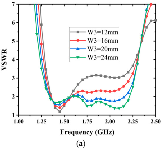 To demonstrate the sensitivity of the structure parameters, four key parameters are discussed in this section. Firstly, W3 is chosen and analyzed. As shown in Figure 8a, with the decrease in W3 (meaning the slot on the bent structure is narrower), the VSWR on the middle and upper band becomes larger, while it becomes better around 1.45 GHz. As shown in Figure 8b, the operating band moves to a lower frequency slightly with the increase in L2. The in-band matching becomes better when L2 ranges from 4 to 12 mm. Therefore, L2 is a key parameter to make a fine tuning to the impedance matching in the operating band. As shown in Figure 8c, the VSWR on the lower band becomes better with the increase in a. However, the middle and upper bands deteriorate. As shown in Figure 8d, with the increase in b, the VSWR on the lower band also becomes better while the middle and upper bands deteriorate again. To compromise the low-profile characteristic and wideband operation, these parameters of W3 = 22 mm, L2 = 12 mm, a = 20 mm, and b = 12 mm are chosen for the proposed antenna.