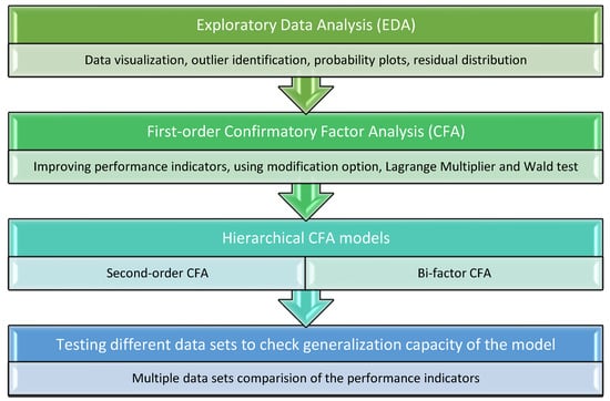 The methodology of this research study consisted of the following steps (as in Figure 1): (1) first, an exploratory data analysis (EDA) was performed to visualize the data distribution and identify outliers to further treat them and help improve the model performance; (2) the first-order CFA was initially performed with the modification option on to check whether there was additional room for improvement. The Lagrange Multiplier and Wald tests were included in the modification option. However, these modifications were moderately approached and verified with the theory; (3) third, more complex CFA models were created to verify if the performance indicators could be further improved. Moreover, these models (second-order CFA and bi-factor models) allowed us to consider one or more latent factors that were not easy to measure in questionnaires; (4) forth, more tests were performed to prove that the models did not capitalize on chance in a data set and they could provide good results with other data sets as well.
