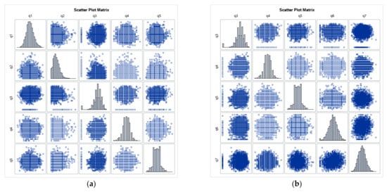 Scatter plot and distribution of variables (a) q1–q5, (b) q3–q7 of the pre-trial data set.