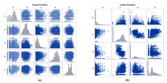 Scatter plot and distribution of variables (a) q1–q5, (b) q6–q9 of the post-trial data set.