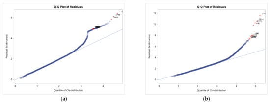 Q-Q plot of residuals (a) pre-trial data set and (b) post-trial data set.