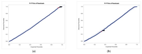 P-P plot of residuals (a) pre-trial data set, (b) post-trial data set.