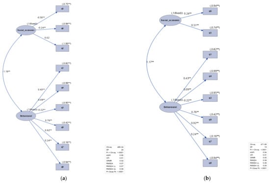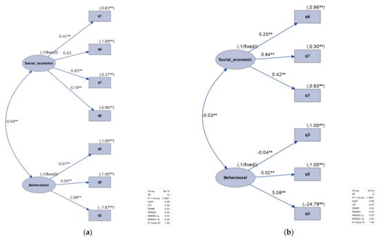 In Figure 8, the two path diagrams for the pre-trial data set are displayed before and after modification option. The q4 variable did not load on F1 (social–economic factor) and CFI improved from 0.94 to 0.97, which indicates a better fit.