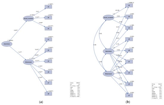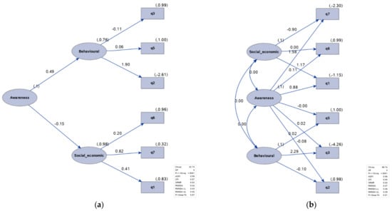 Furthermore, two hierarchical models were created for the two data sets. These complex models allowed us to insert a new latent variable ‘Awareness’ that could be affected by social–economic and behavioral factors (as in Figure 10 and Figure 11). In the second-order CFA model, social–economic and behavioral factors were the first-order latent factors, while awareness was the second-order latent factor. The first-order factors acted as an intermediary layer between the second-order factor and observed variables. On the contrary, in the case of the bi-factor model, the observed variables loaded on two factors (one group and one general factor).