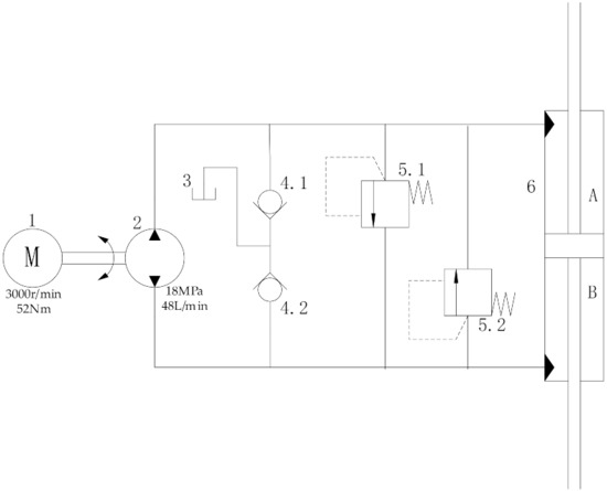 Figure 1. Hydraulic system diagram of electro-hydraulic servo pump control system: 1—servo motor; 2—quantitative pump; 3—hydraulic oil tank; 4—check valves; 5—relief valves; 6—hydraulic cylinder.