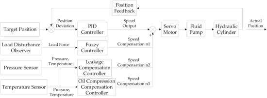 In Figure 2, the position deviation of the hydraulic cylinder is processed by the PID controller then the basic speed is input into the servo motor. The load disturbance of the system is observed by the observer and then enters the fuzzy controller. The fuzzy controller inputs the compensation speed n1 to the servo motor. The pressure sensor signal and temperature sensor signal are fed back to the leakage compensation controller and the oil compression compensation controller. After being processed by the controller, the compensation speeds n2 and n3 are input into the servo motor, and the servo motor drives the quantitative pump to rotate and drive the hydraulic cylinder to move.