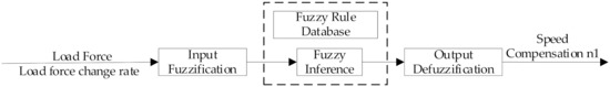 The design of the fuzzy compensation controller includes three main parts, as shown in Figure 3. Firstly, the input/output variables of the load force and load force change rate are fuzzified, and the exact quantity is transformed into a fuzzy subset in a certain domain. Then, the fuzzy variables are compared with a fuzzy rule database for fuzzy reasoning. Finally, the output is defuzzified to obtain the accurate value of speed compensation.