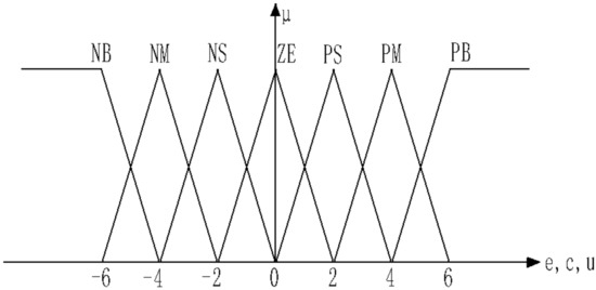 Membership function is the application basis of fuzzy control, mainly including triangle type membership function, Gaussian membership function, bell membership function, ladder membership function, and S-type membership function. The function of the membership function is to convert the output fuzzy quantity into an accurate quantity. When the slope of membership function is small, the controller can get higher steady-state accuracy; when the slope of membership function is large, the response speed of the system becomes faster. The input (E, C) and output (U) of the controller are all trigonometric membership functions which are widely used and easy to operate. The membership function of the fuzzy compensation control is shown in Figure 4.