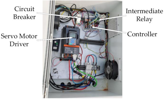 The experimental platform used to test the electro-hydraulic servo closed-pump control is composed of a hydraulic part and an electrical part. As shown in Figure 5, the hydraulic part includes the electro-hydraulic servo pump control unit, symmetrical hydraulic cylinder, nitrogen spring load, and spring load. The inertial load is used as the load force of the system, and the nitrogen spring load is used as the load disturbance force of the system. The load disturbance force of the system is adjusted by changing the compression of the spring. The electrical part is composed of the circuit breaker, servo motor driver, controller, and intermediate relay, as shown in Figure 6. The electro-hydraulic servo pump control unit integrates the power components and control components, which have such advantages as high power density and convenient layout. The system controls the speed and torque output by the servo motor through the driver and then controls the pressure and flow in the system so as to accurately control the output and position of the hydraulic cylinder. The main parameters of the experimental platform are shown in Table 2