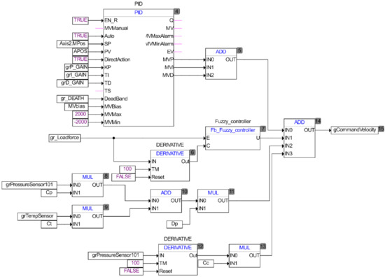 The software part of the experimental platform is shown in Figure 7, which is mainly composed of PID control module, fuzzy compensation module, oil leakage compensation module, and oil compression compensation module. The speed of these four outputs constitutes the total speed of the motor output. The control test only uses the traditional PID control module to output motor speed. The program is downloaded to the controller through EtherCAT communication to realize the logic processing and operation of the system. The software used in the experiment is AutoThink software matched with HollySys motion controller, which is developed based on IEC61131-3 standard.