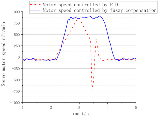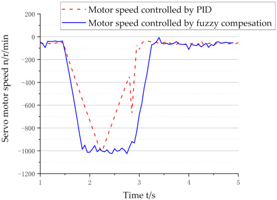 The response curve indicates that when the retraction displacement signal is transmitted, the speed of the servo motor quickly rises to about −1000 r/min and reaches a stable state. There are no sudden changes in the speed of the servo motor, and the position tracking accuracy of the system is controlled within ±0.005 mm under the overload of the nitrogen spring. However, the response speed of the servo motor is slow under PID control. When the disturbance force appears, it fluctuates significantly, and the position tracking accuracy of the system is low.