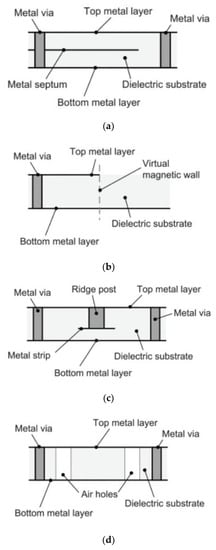 - Bozzi, M.; Winkler, S.A.; Wu, K. Broadband and compact ridge substrate-integrated waveguides. IET Microw. Antennas Propag. 2010, 4, 1965–1973. [Google Scholar] [CrossRef]