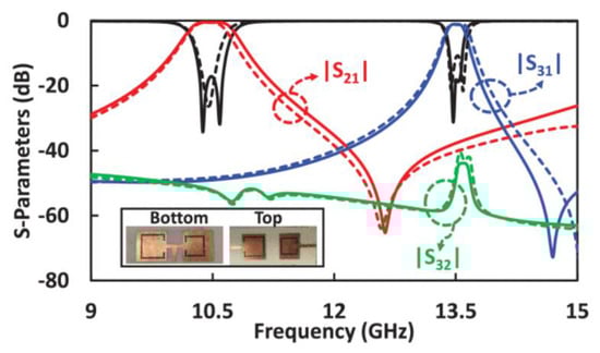 - Xie, H.-W.; Zhou, K.; Zhou, C.-X.; Wu, W. Compact SIW diplexer and dual-band bandpass filter with wide-stopband performances. IEEE Trans. Circuits Syst. II Express Briefs 2020, 67, 2933–2937. [Google Scholar] [CrossRef]