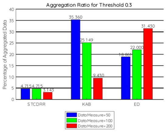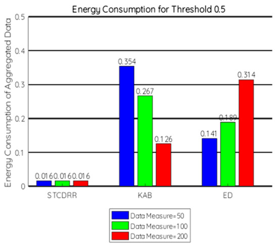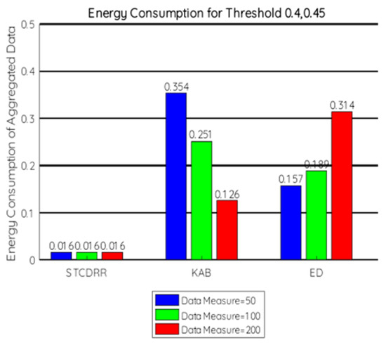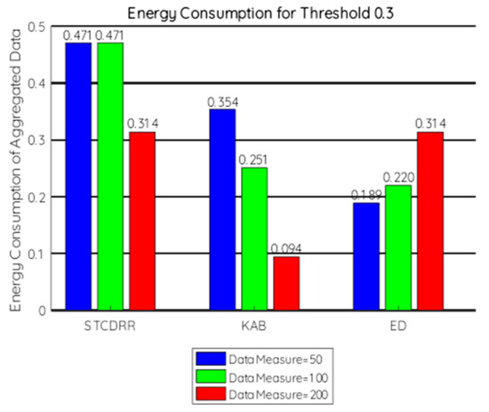 Energy consumption for varying threshold values can be observed in Figure 5, Figure 6 and Figure 7. It is observed that with a minimum threshold value, i.e., 0.3 the energy consumption of our proposed approach is comparatively higher than KAB and ED. However, with the increase of the threshold value, there is a subsequent decrease in energy consumption in the proposed approach which implies the efficiency of the proposed algorithm. The STCDRR protocol can save from 70% up to 90% of the energy of the sensor node which makes it suitable for enhancing the network lifetime. Here, we have calculated the energy in terms of miliJoule (mJ).