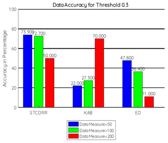 The main goal is to send very less data to the destination node or sink. In the KAB technique, only one set of data elements is sent among a group of sets to the sink which in turn increases the loss of data measurements. However, in ED, the integrity of conservation of information is maintained. Figure 8, Figure 9 and Figure 10 imply the data accuracy for three approaches with varying threshold values. It is clearly visible from the graph that the proposed protocol gives the best results in terms of measurement of the accuracy of the data.