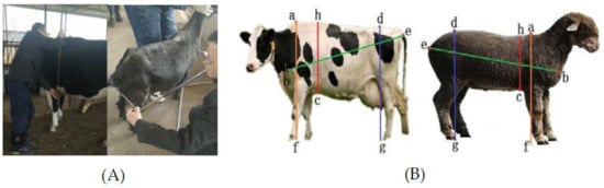 (A) Manual measurement of cattle and goat body dimensions; (B) Illustration of four measured body dimensions: Line (a,f) is withers height, line; (b,e) is body length, line; (c,h) is chest depth line; (d,g) is hip height.