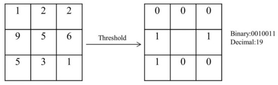 To be specific, represents an operator proposed by Ojala et al. [30] to describe the local texture features of images; it is defined in 3 × 3 windows, while the value of 8 adjacent pixels was compared with the threshold value of the center pixel of the window. If the surrounding pixel value was greater than the central pixel value, the position of the pixel was marked as 1, but otherwise was 0. In this way, the LBP operator of the central pixel of the window could be obtained, and this value could be used to reflect the texture information of the region. The process was shown in Figure 4.