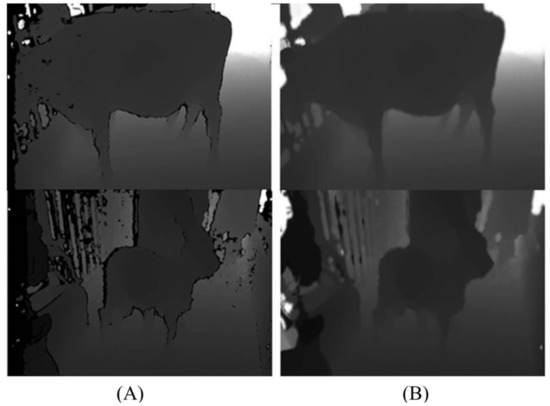 Table 5 lists the body size measurement result of cattle, better than that of goats. Besides the effect of fur, another reason was that during the depth data collection, the behaviors of goats were more active than cattle; therefore, the distance between livestock and depth camera is not consistent. In many goat images, the area occupied by the torso is smaller than that of cattle; thus, there were more holes and texture copying artifacts in the depth images. The mentioned holes and texture replication artifacts would exist around the feature points, and would also affect the background segmentation and feature point extraction even after the depth image super-resolution reconstruction.