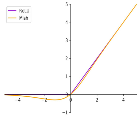 Since the positive semi-axis derivative of the Mish was greater than 1, it avoided the saturation because of the function capping, while preventing the gradient from disappearing. The negative semi-axis of the Mish was not always zero, whereas it remained a small value, which solved the problem of neuron death; moreover, Mish improved the sparse expression of the network and addressed the gradient disappearance attributed to the lack of training data and the increase in network layers. According to existing studies, a smooth activation function can more effectively allow the information to penetrate the neural network [32]. Better generalization results can be achieved since the Mish is smoother than that of ReLU.